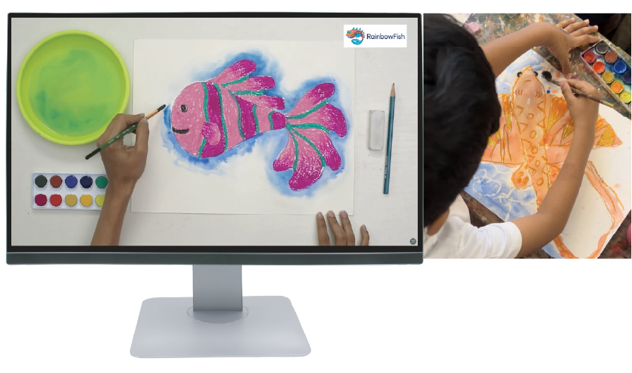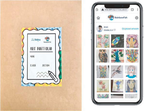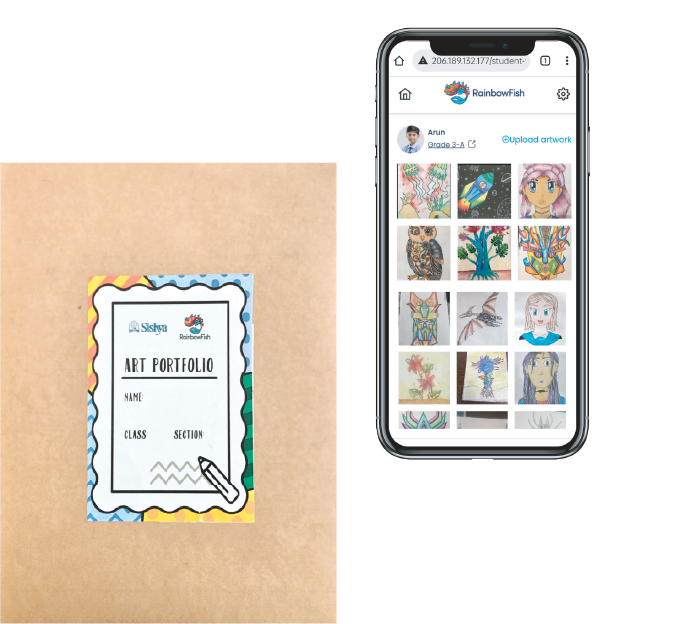 Every student will be given a physical portfolio with special art paper and worksheets for all their projects. They will get a log-in to a RainbowFish e-portfolio app that they can access from any phone or laptop. The e-portfolio allows each parent or student to share images of their artwork with friends and loved ones.